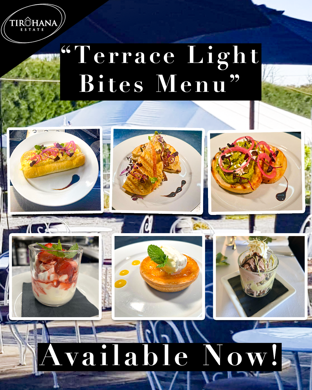 We are open each day of the Summer season for lunch and dinner. We also have all day dining options available including our lighter-style options including the Tirohana High Tea or our Terrace Light Bites Menu. Outdoor dining (wish shaded umbrellas) is also available on our outside patio terrace overlooking the vines.